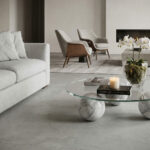 The new Avignon Quartzite is a perfect stone to use for this. It has both warm and cool tones and has an exciting design that feels lavish and luxe. Its amber-colored veins are a remarkable pair with the white and grey primary colors. It matches perfectly, almost too perfectly, with neutral painted walls and a mirror to bring about the depth to the space.