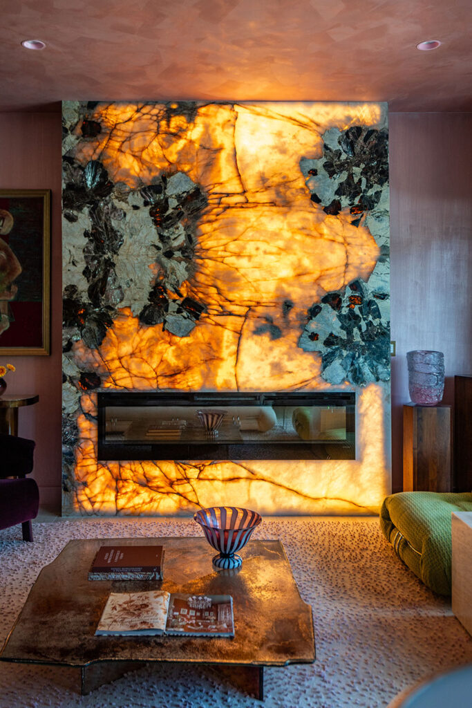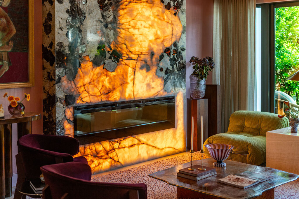 With its deep violets and electric crystal veining, the stone demands attention, anchoring a room filled with plush textures, metallic accents, and soft blush tones.