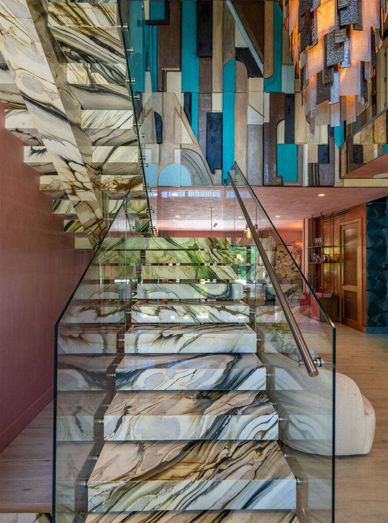 The veins dance from step to step in fluid motion, catching the light from a chandelier above. It’s more than just a staircase; it’s a runway for the rest of the house.