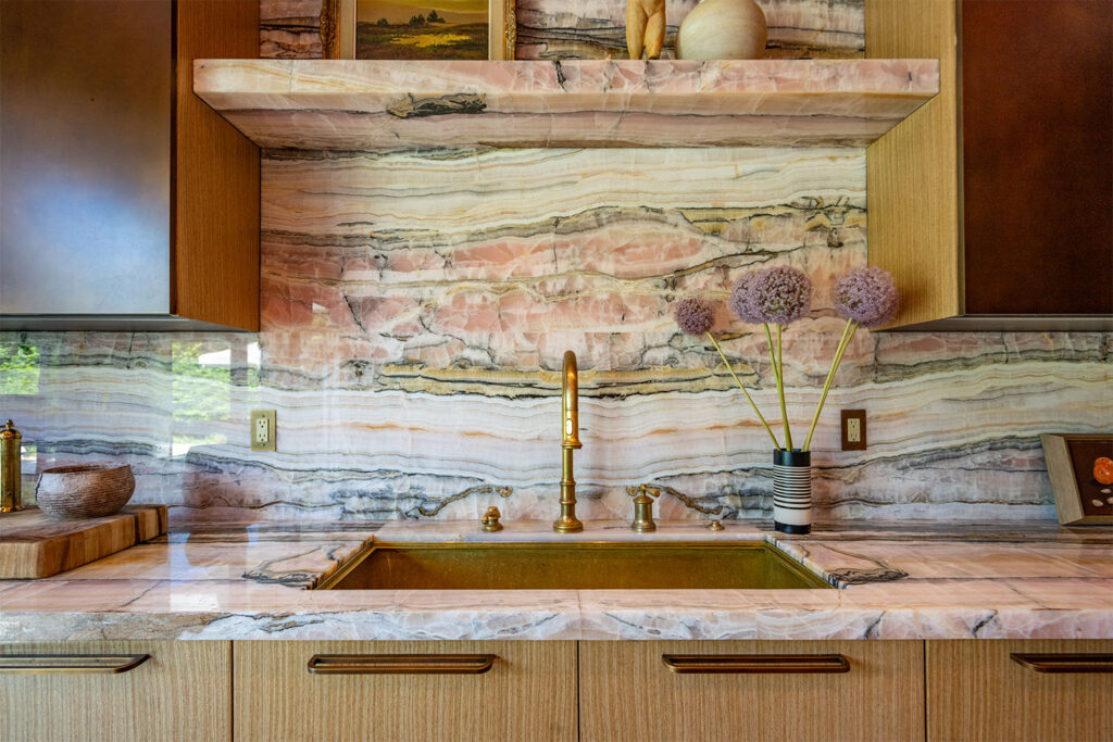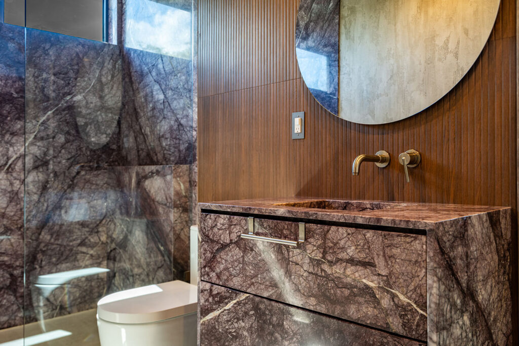 Forget subtle – this guest bath is pure spectacle. Drenched in Cipollino Rosso Ondulato Marble from wall to vanity, it doesn’t hint at drama; it dials it all the way up. It’s textured, tonal, and totally fearless. Step in, and try not to stare.