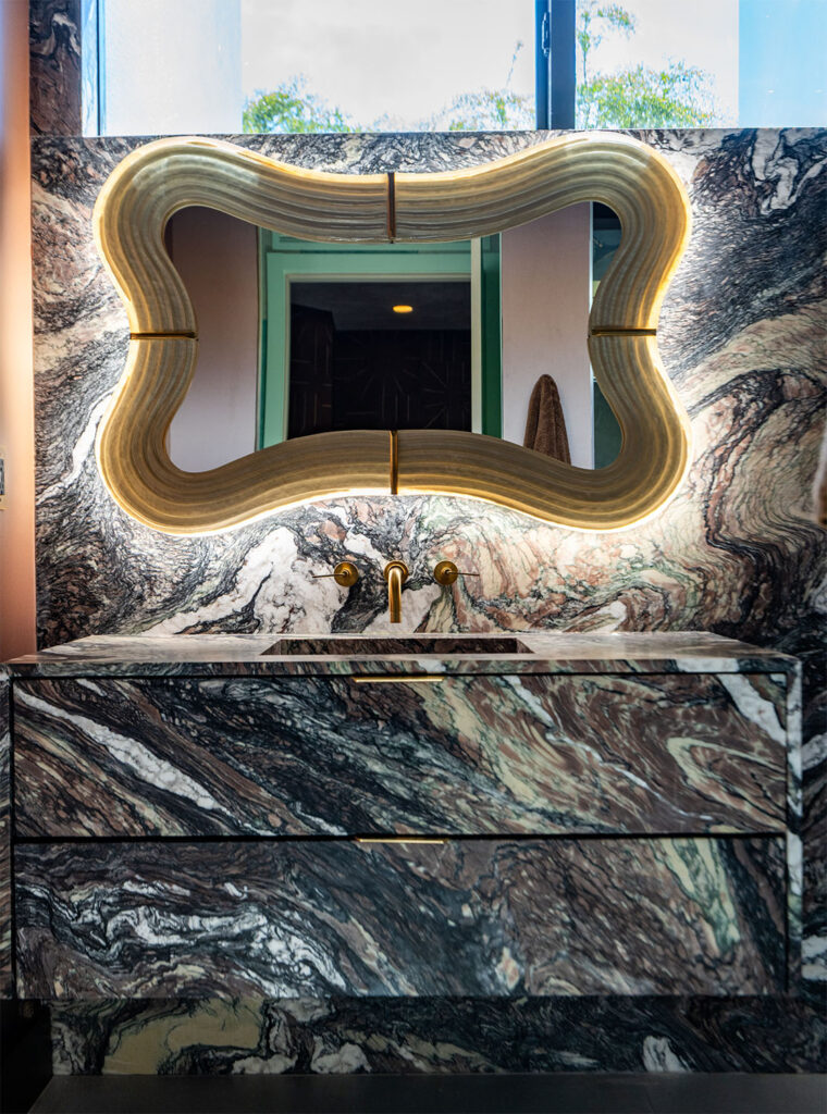 A room-by-room journey through curated chaos, fearless materiality, and unapologetic design. From sculptural staircases to deeply personal bathrooms, here’s how stone became a driving force in this boldly layered home. Continue reading to take a tour.