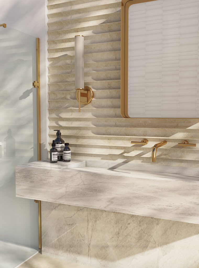 Then came the head turners, Calacatta Lincoln Gold, a true marble with gilded veining, delivered style with history in its DNA. Dandy flipped the script with bold color and marble looks in playful porcelain. And Geometric Ivory Pearl reminded us that stone can be sculptural – cut from real travertine and made to make a statement.