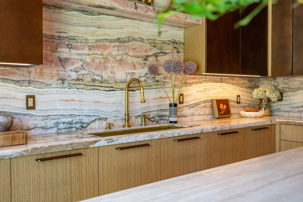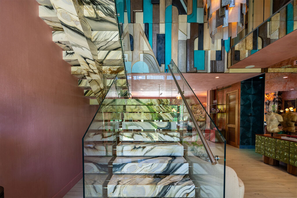 Travis London’s Miami home wasn’t just a project; it was a masterpiece. Every room turned up the volume, from the Razzle Onyx-clad kitchen counters and backsplash, the fireplace lit up in Super Crystal Amethyst Granite, all the way to the Calacatta Illusion stairs.