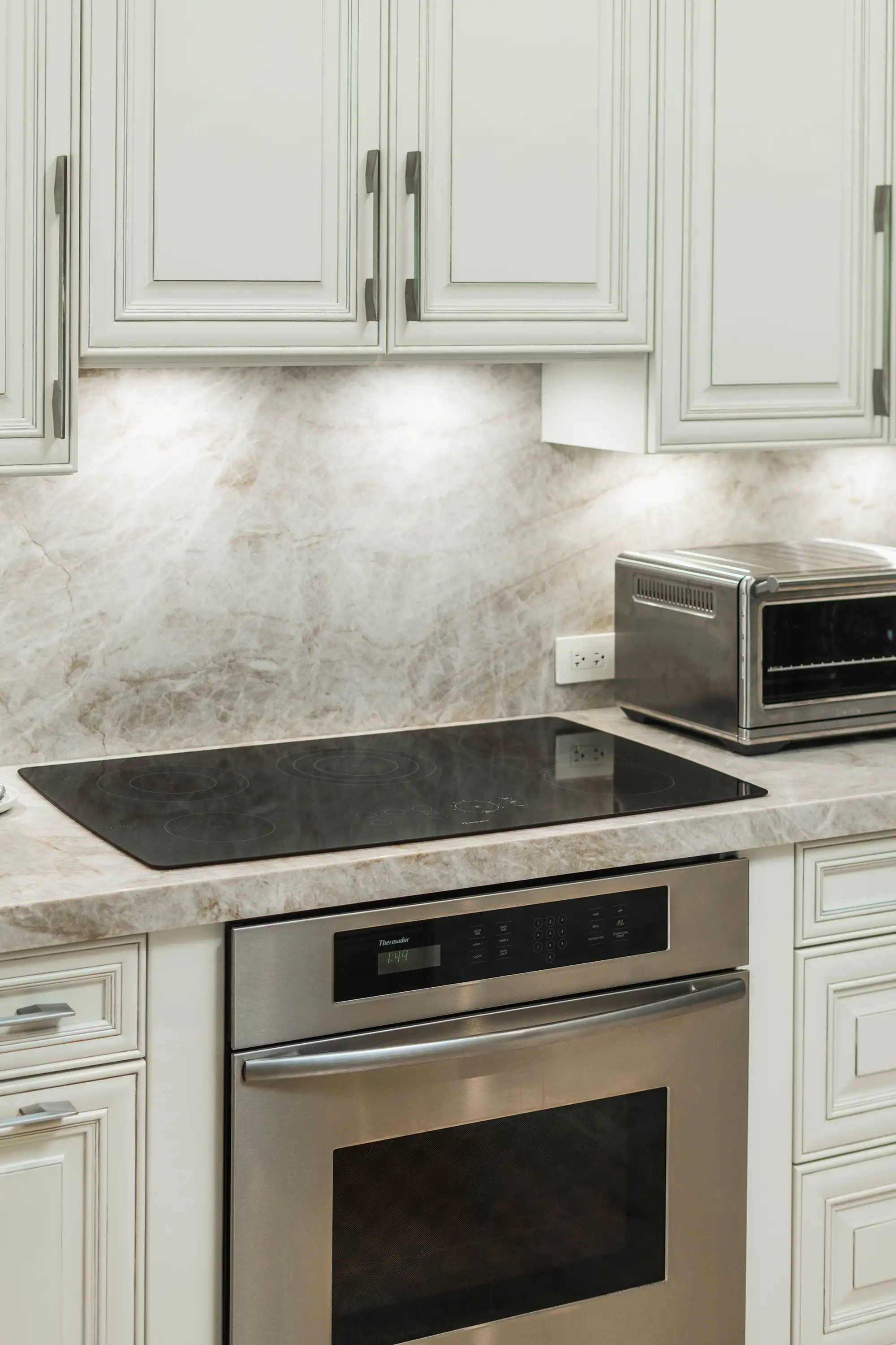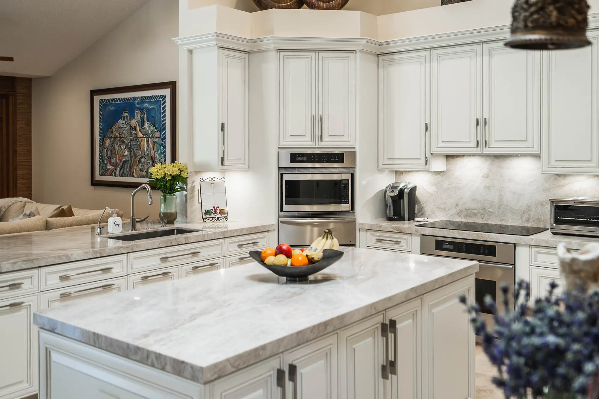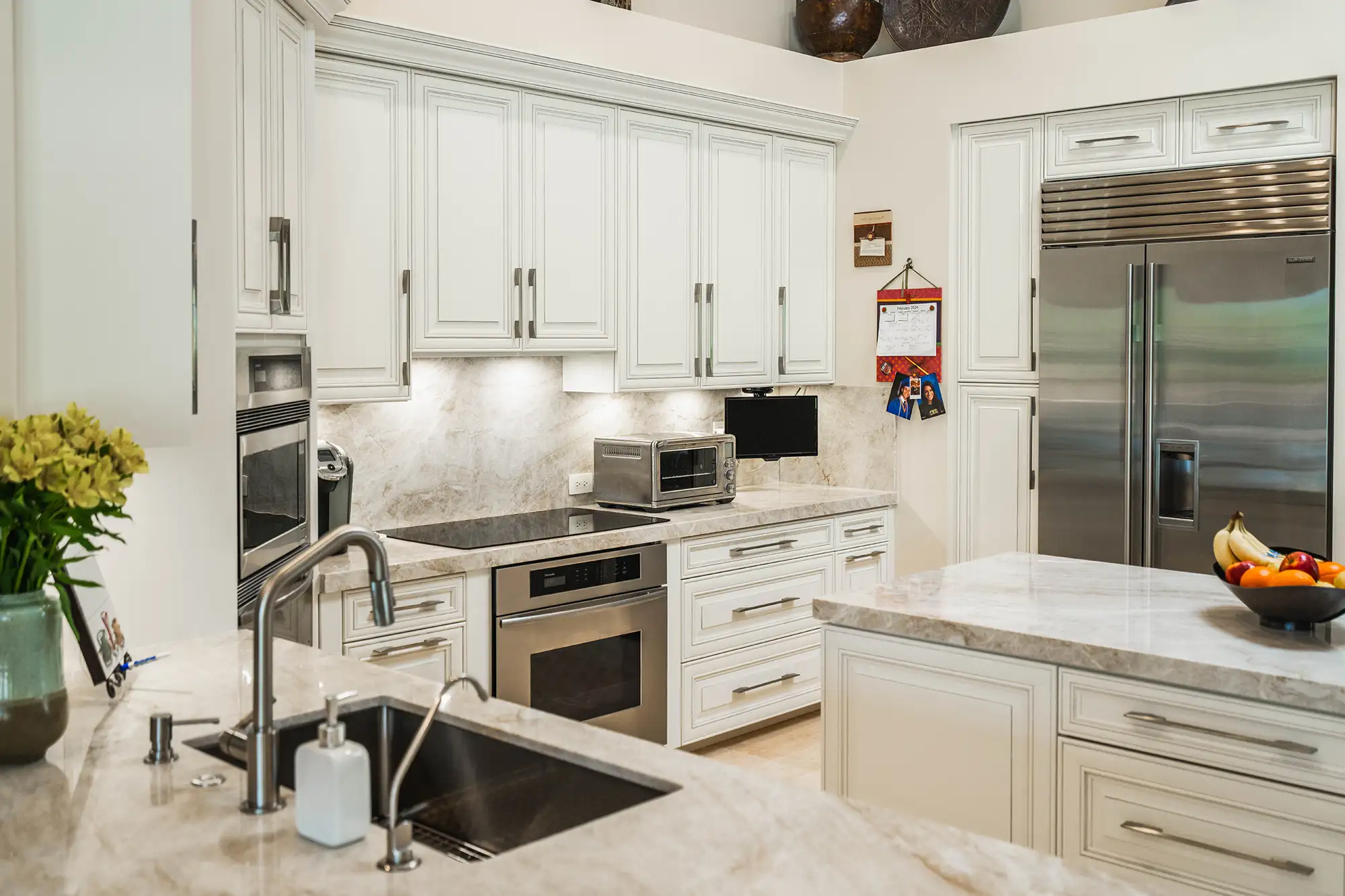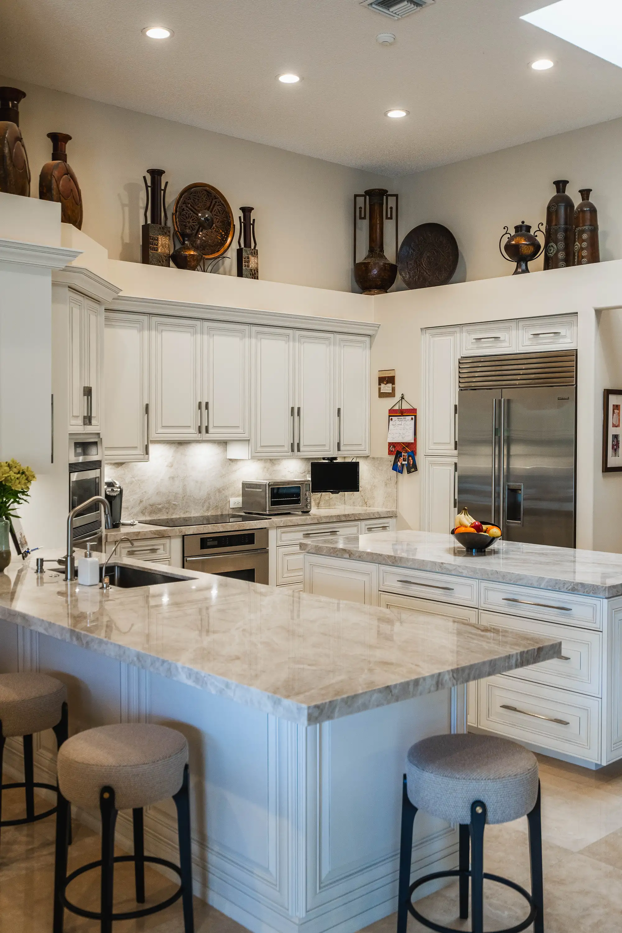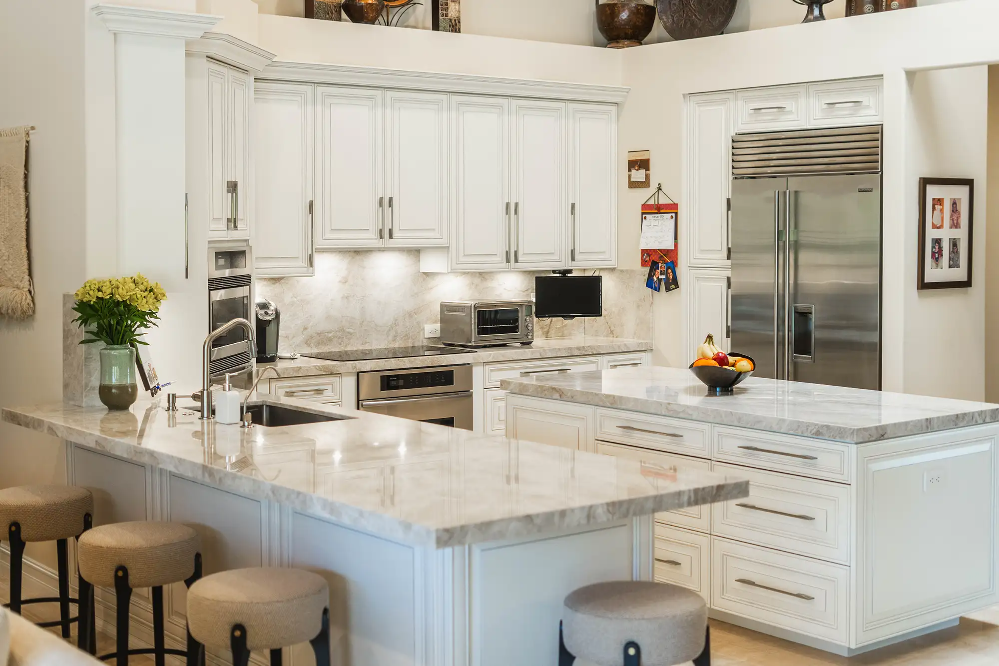 Step inside this stunning Weston family home where the popular Taj Mahal Quartzite reigns supreme, from the sweeping kitchen island to the elegant bath vanities. Its creamy backdrop and warm veining elevate every surface into pure luxury.