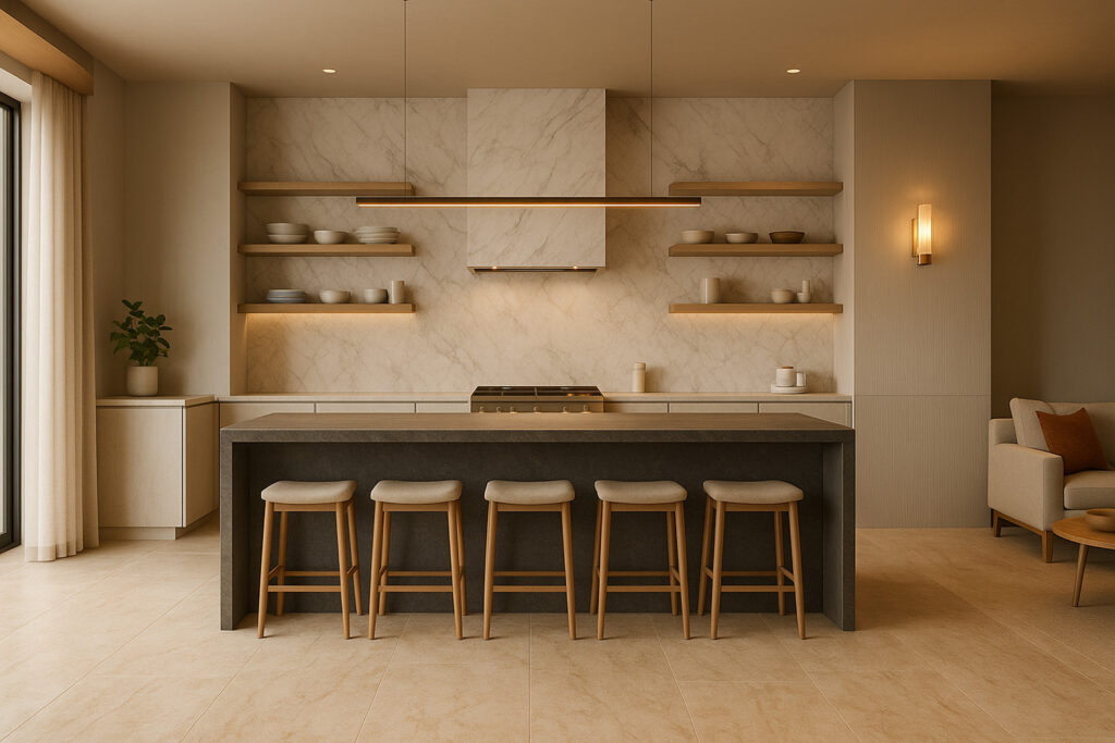 Taj Mahal Quartzite has that warm, creamy tone that makes every space feel like a soft-focus sunset.It works beautifully anywhere; whether it’s a casual living room, a chef-worthy kitchen, or an outdoor retreat. In other words, it plays well with summer, but it shows up year-round.